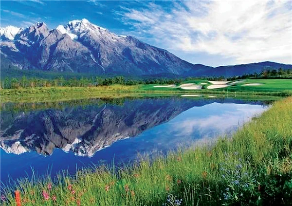 7、8月,金黄的草原,黛青的山崖,皑皑白雪倒映在水里,明镜秋水,颇有“半湖青山半湖水”。