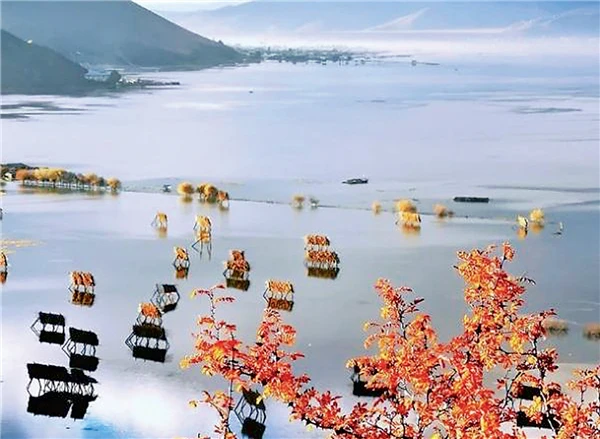 秋冬来临,草原一片金黄,皑皑白雪的山峰倒影于湖泊中,来这里过冬的迁徙鸟有300多种,4000多只,黑颈鹤、黄鸭、班头雁在草丛中、水面上嬉戏,给广阔空灵的草原带来了生气。