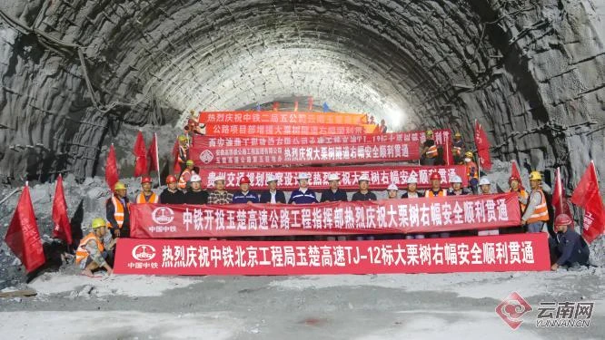 大栗树隧道是玉楚高速公路项目全线地质条件最差、施工难度最大的高风险控制性工程,左幅设计2118米、右幅2134米。隧道岩质软弱、破碎、呈粉末状,岩体渗水,围岩开挖沉降收敛变形大,属于Ⅲ级大变形风险隧道。中铁北京工程局玉楚高速项目部充分发扬“开路先锋”精神,迎难而上、积极探索,强化24小时带班作业,严格落实“管超前、严注浆、短开挖、强支护、早封闭、勤量测”十八字方针,加大监控测量数据分析,缩短工序衔接时间,战溜塌控变形,抢抓施工进度,确保隧道右幅施工安全顺利贯通。