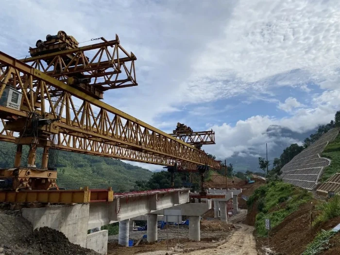 瑞孟高速公路班箐三号大桥设计T形梁共65片,桥面最大纵坡2.6%。为保障梁板的顺利吊装,总包部和项目部及时协调解决现场问题,严格把控梁板预制、运输及架设等各个环节,紧密衔接工序,确保各项工作有序推进。