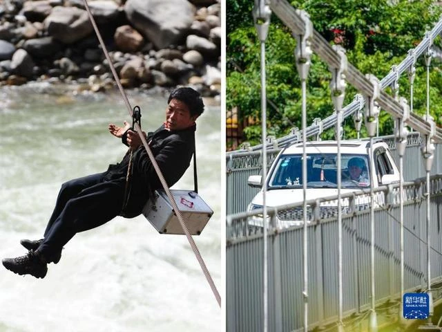 这是一张拼版照片:上图为2013年2月2日,在云南省怒江州泸水市六库街道,一名居民背着背篓溜索过江(新华社记者王长山摄)。下图为2022年9月13日,泸水市居民骑摩托车通过大兴地桥(无人机照片,新华社记者江文耀摄)。新华社发