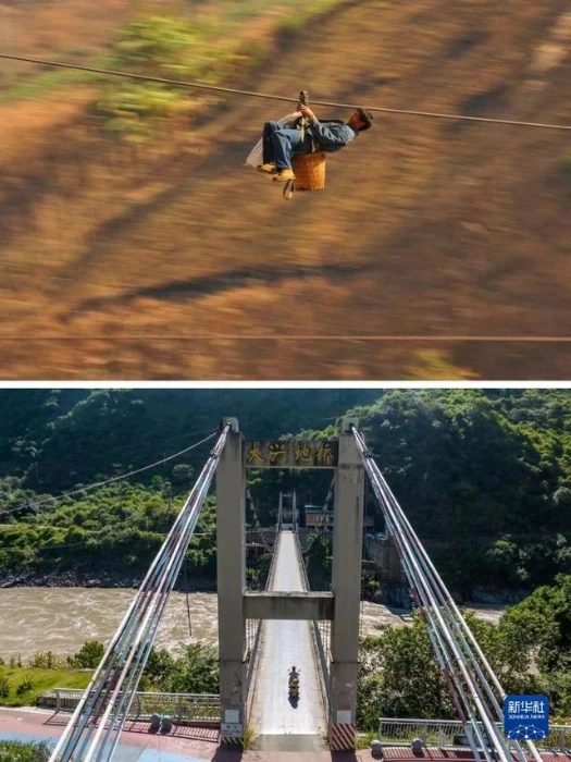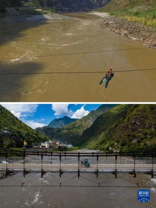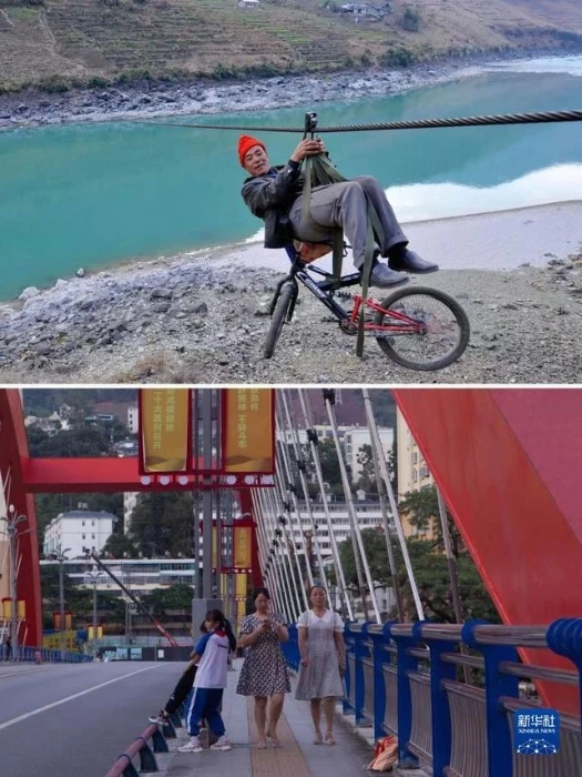 这是一张拼版照片:上图为一名男子带着自行车在怒江州泸水市六库街道双米地村辣子咪村民小组溜索过怒江(资料照片,新华社记者蔺以光摄)。下图为2022年9月14日,居民在六库街道桥上散步休闲(新华社记者岑云鹏摄)。新华社发