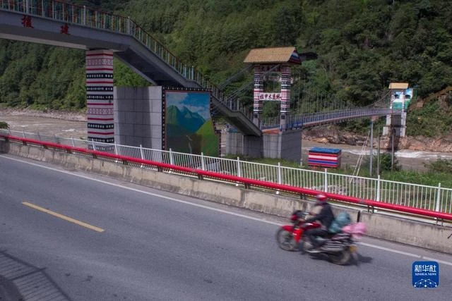 2022年9月14日,怒江州福贡县拉甲木底村居民驾驶摩托车从拉甲木底桥下驶过。这座桥将过街天桥和过江桥梁相结合,方便行人过江、过街。新华社记者 岑云鹏 摄