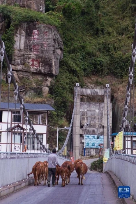 2022年9月14日,怒江州泸水市悬崖村居民赶牛通过怒江上的桥梁。新华社记者岑云鹏摄