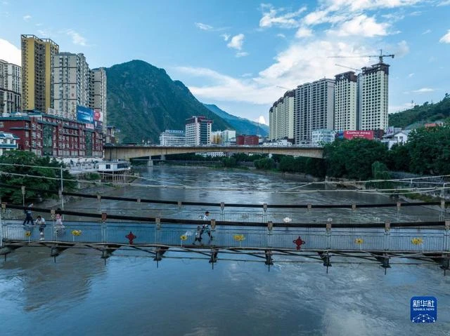 2022年9月14日,怒江州泸水市六库街道居民在桥上散步(无人机照片)。新华社记者 江文耀 摄