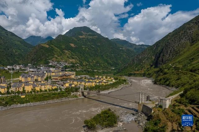 这是2022年9月13日拍摄的怒江州泸水市维拉坝幸福桥。这座桥连接着居民安置点与农业生产区(无人机照片)。新华社记者 江文耀 摄