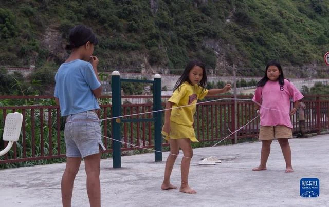2022年9月14日,怒江州福贡县托坪村五湖易地扶贫搬迁安置点的小朋友在江边跳皮筋。新华社记者 岑云鹏 摄