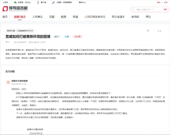 近日,有网友留言宣威如何打破高铁环绕的困境。对此,曲靖市交通运输局于9月1日进行了回复: