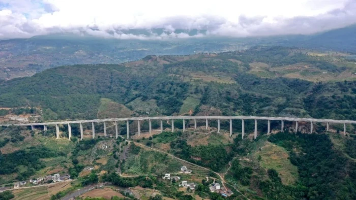 昆倘高速2标全长近17千米,包括9座桥梁、1座隧道、互通立交2座。其中,全线控制性工程散旦特大桥日前完成最后一片梁片的架设任务,眼下正在进行桥面施工作业。