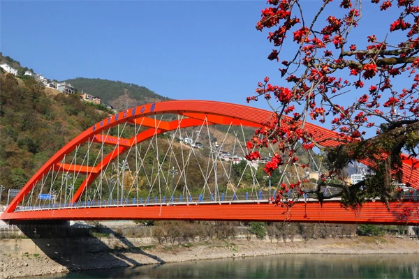 山河遥远,以心为桥。从1995年起就挂联帮扶怒江傈僳族自治州的中交集团援建,“中交怒江连心桥”于2018年8月8日在“木棉王”北侧破土动工,桥名寓意“中交集团与怒江各族人民心连心,同甘共苦,团结奋进”。主桥采用一跨过江的钢箱梁下承式提篮拱,主桥跨径144米,单跨顶推100米,是亚洲单跨顶推跨径最大的桥梁。2020年8月12日大桥建成后,每当夜幕降临,华灯初上,中交怒江连心桥灯火辉煌,如同绚丽多彩的双虹桥,凌江飞跃。桥面上,三三两两的市民们登桥凭栏眺望,观赏夜景。连心桥造型独特,像长虹卧江,与两岸天然景色浑然一体,非常美丽壮观,已经成为六库城市的地标和网红打卡地。