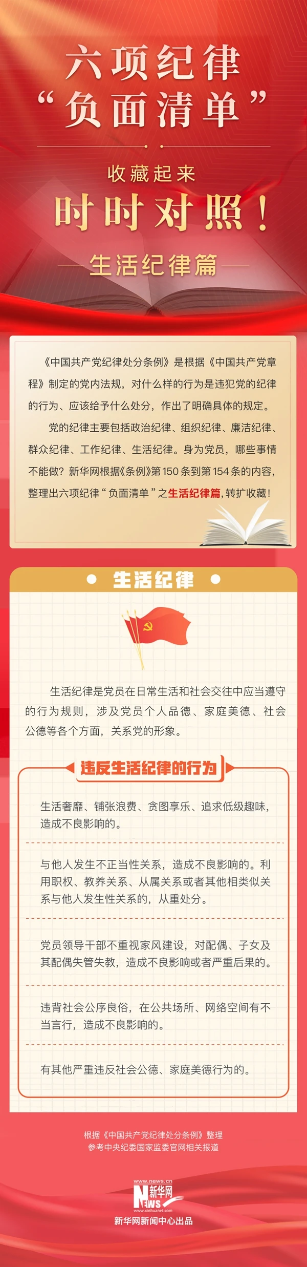 当前,全党正在开展党纪学习教育。这次党纪学习教育明确要聚焦解决一些党员、干部对党规党纪不上心、不了解、不掌握等问题,组织党员特别是党员领导干部认真学习《中国共产党纪律处分条例》,做到学纪、知纪、明纪、守纪,搞清楚党的纪律规矩是什么,弄明白能干什么、不能干什么,把遵规守纪刻印在心,内化为言行准则,进一步强化纪律意识、加强自我约束、提高免疫能力,增强政治定力、纪律定力、道德定力、抵腐定力,始终做到忠诚干净担当。今天推出“负面清单”之生活纪律篇,一起收藏学习。
