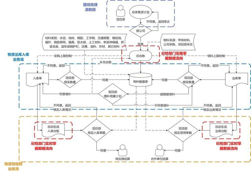 针对交通工程物资采购量大、种类繁杂、流转环节多的特点,公司纪检监察融入“物资全链条管理模块”,实现从“申请—发货—入库—领用—清点”的全流程闭环管理。水泥、地材等主要建材的现场需求申请、供应商溯源、发货地、入库时间、入库数量、领用时间、领用数量及领用人等信息均实现全过程留痕记录。