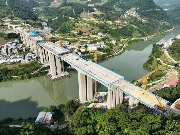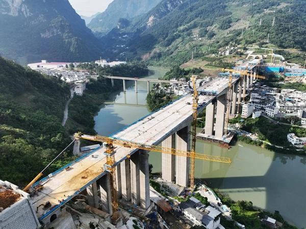 自2022年3月开工建设以来,面对“高空作业、雨季洪峰、峡谷风场、生态敏感”等多重施工挑战,建设团队采取多项措施解决施工难题。一是通过加强临边防护,建立健全水上应急救援体系,配置了水中应急救援机器人,落实防洪保障措施,多次度过雨季洪峰,保证了施工安全。二是开展精密复测和沉降观测,创新设计桥梁墩柱智能喷淋养护系统,在混凝土浇筑中采用预埋温度传感器实时监控混凝土表面及内部温度,采取控制冷凝管内冷却水的流量、流速、温度来降低混凝土内部水化热产生的高温,减少混凝土内外温差,确保桥梁施工质量。三是在涉水桩基施工中采用泥浆分离器净化泥浆,在施工中做好废物回收,做到施工零排放,布设江面污染阻拦装置,回收废弃物,保护水资源,最大限度降低了施工对生态环境的影响。