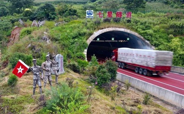 在文化根植方面,寻沾高速(昆明段)巧妙将长征精神融入路域文化肌理,以“绿色为底、红色为魂”,红绿交融筑根基,串起“红色记忆”。通过隧道口、边坡、收费大棚,打造“峥嵘岁月”“运筹丹桂”“红色记忆”“军民鱼水”为主题的路域文化墙,通过铝板浮雕,再现红军长征时期“前无险阻、风餐露宿、沐雨栉风”的峥嵘岁月和红军长征过寻甸的线路以及事件的重要历史场景,实现“路景交融、文脉相传”。