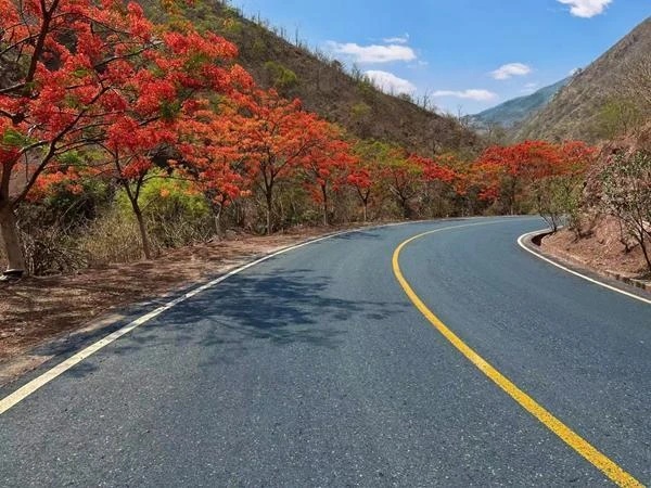 在元谋热坝区路段,依托当地温暖湿润的气候优势,公路沿线大面积种植凤凰木、夹竹桃等热带花卉。盛夏时节,红色的凤凰花开得热烈奔放,夹竹桃绽放得绚烂夺目,将公路装扮成“永不落幕的盛夏”景观带,尽显热带风情。