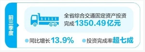 今年1月召开的全省交通运输工作会议强调,加快完善服务国家战略的综合立体交通网络。重大项目建设高歌猛进的背后,是全省综合交通投资的强劲支撑。前三季度,全省综合交通固定资产投资完成1350.49亿元,同比增长13.9%,完成年初制定目标1800亿元的75.0%。