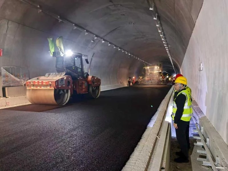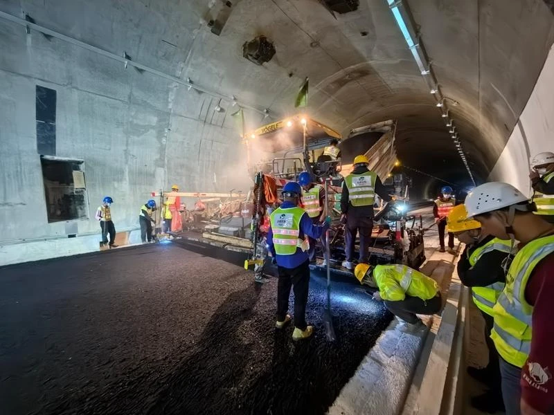 绿色施工赋能,作业环境焕新。与传统热拌沥青相比,该低温改性沥青混合料拌和、摊铺温度大幅降低,施工中几乎无烟尘,有害气体排放量显著减少,可从根本上改善隧道作业环境。现场施工人员反馈,作业环境清爽,无需佩戴防护设备,工作效率明显提升。同时,该技术无需额外增设隧道通风设备,节省施工成本,契合国家节能减排与“双碳”战略要求,实现绿色与高效施工的统一。