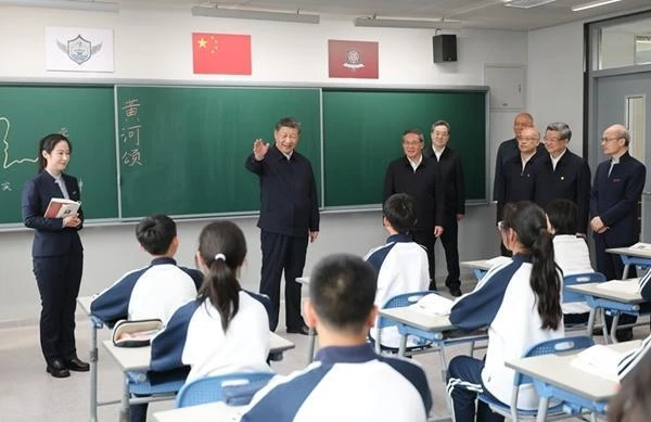 3月23日,中共中央总书记、国家主席、中央军委主席习近平在河北雄安新区考察,并主持召开深入推进雄安新区高质量建设和发展座谈会。这是23日上午,习近平在北京四中雄安校区考察时,走进教室同师生亲切交谈。新华社发(盛佳鹏 摄)